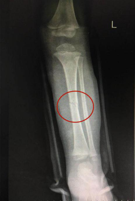 經(jīng)當?shù)蒯t(yī)院照X光顯示,橦橦左脛腓骨中段骨折,建議全身麻醉下行彈性髓內(nèi)釘手術。
