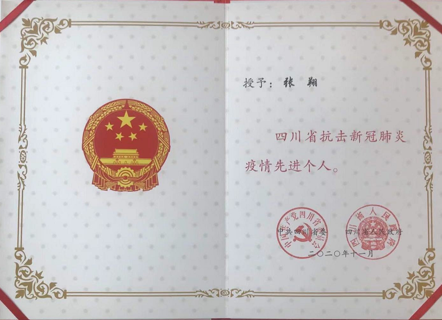 在病區(qū),張翔除了看病、查房,他還坐上負(fù)壓救護(hù)車(chē)共出診過(guò)3次,接回確診患者5人。因?yàn)榍捌谌耸植蛔?,剛進(jìn)艙時(shí),他需要連續(xù)值完24小時(shí)的班后才能休息。為了節(jié)約防護(hù)物資,他整天不喝水,以減少上廁所的頻次。長(zhǎng)時(shí)間身著防護(hù)服、隔離衣以及佩戴口罩、護(hù)目鏡帶來(lái)的壓抑感讓他出現(xiàn)了胸悶、頭暈、體力不支等情況。他努力克服高強(qiáng)度工作帶來(lái)的各種不適感和心理壓力,與病魔爭(zhēng)分奪秒。在他和進(jìn)倉(cāng)同事的精心救治和共同努力下,3例危、重癥患者病情逐漸趨于穩(wěn)定,2例感染患者成功治愈,成為瀘州市首批治愈出院的患者。面對(duì)這一切,張翔說(shuō),自己是羌族小伙,2008年汶川大地震,家鄉(xiāng)茂縣也受到了影響,那時(shí)因?yàn)檫€在讀書(shū),沒(méi)有這個(gè)能力,現(xiàn)在有這個(gè)能力了,也是該自己出力的時(shí)候了。張翔表示,將珍惜這份榮譽(yù),在今后的工作中繼續(xù)發(fā)揚(yáng)“生命至上、舉國(guó)同心、舍生忘死、尊重科學(xué)、命運(yùn)與共”的偉大抗疫精神,倍加努力,為人民群眾的健康保駕護(hù)航。