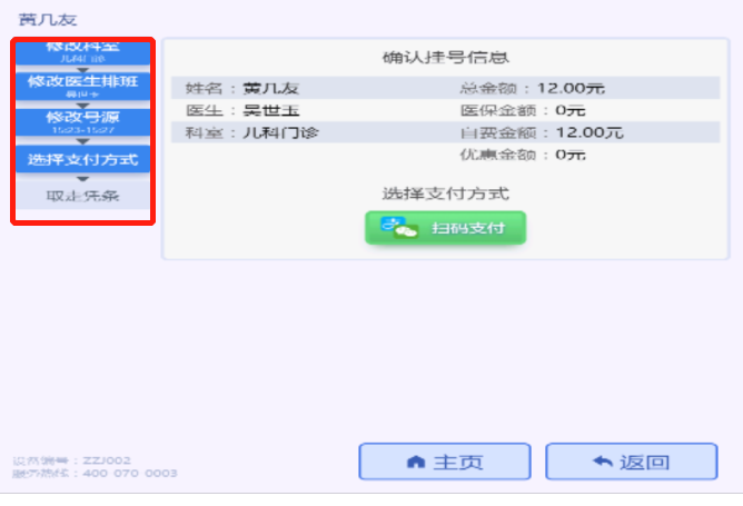 自助選擇對(duì)應(yīng)科室、醫(yī)生、就診時(shí)間段進(jìn)行掛號(hào)。支持支付寶、微信掃碼支付。如需修改掛號(hào)信息,點(diǎn)擊左側(cè)對(duì)應(yīng)信息進(jìn)行修改。