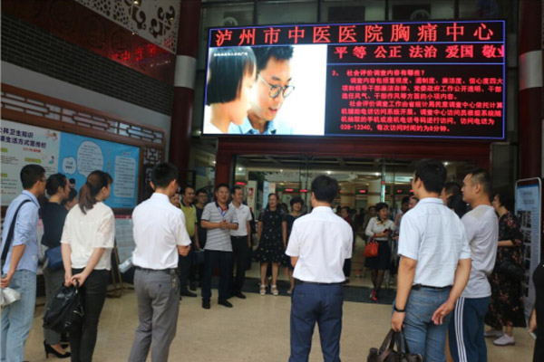 9月27日上午,各省屬醫(yī)院、瀘州市各區(qū)縣衛(wèi)計(jì)局、市直屬醫(yī)療單位的紀(jì)檢、監(jiān)察室領(lǐng)導(dǎo)共計(jì)四十余人蒞臨瀘州市中醫(yī)醫(yī)院,現(xiàn)場(chǎng)參觀醫(yī)院黨風(fēng)廉政建設(shè)社會(huì)評(píng)價(jià)和整治“微腐敗”工作宣傳情況。我院黨委書記、院長鄭海三,黨委副書記王萬芳及相關(guān)職能科室人員陪同。