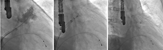 ?????? 左心耳造影圖像???????左心耳封堵器釋放前?????? 左心耳封堵器成功釋放后