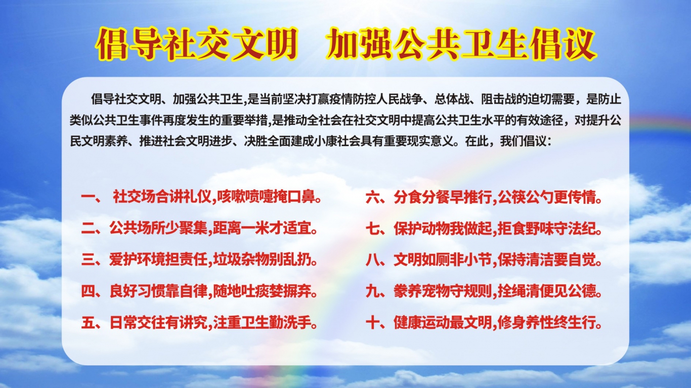 倡導(dǎo)社交文明、加強(qiáng)公共衛(wèi)生,是當(dāng)前堅(jiān)決打贏疫情防控 人民戰(zhàn)爭、總體戰(zhàn)、阻擊戰(zhàn)的迫切需要,是防止類似公共衛(wèi)生 事件再度發(fā)生的重要舉措,是推動全社會在社交文明中提高公 共衛(wèi)生水平的有效途徑,對提升公民文明素養(yǎng)、推進(jìn)社會文明 進(jìn)步、決勝全面建成小康社會具有重要現(xiàn)實(shí)意義。在此,我們 倡議:-、 社交場合講禮...